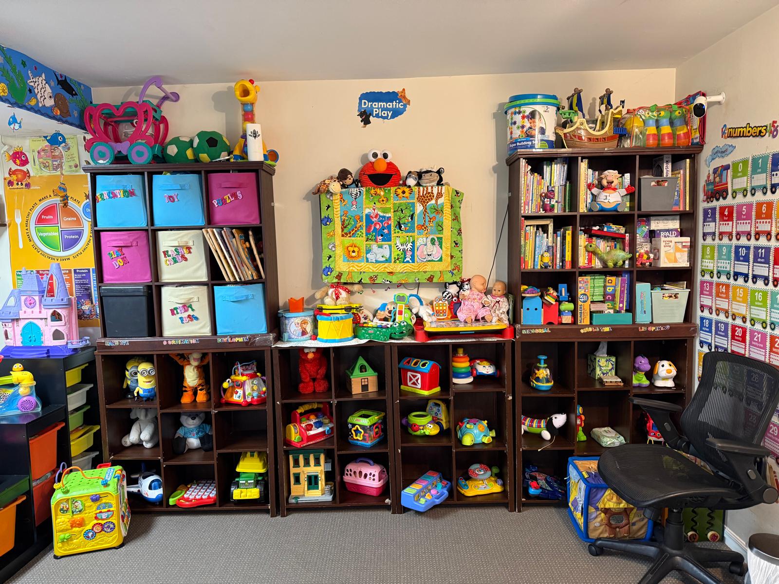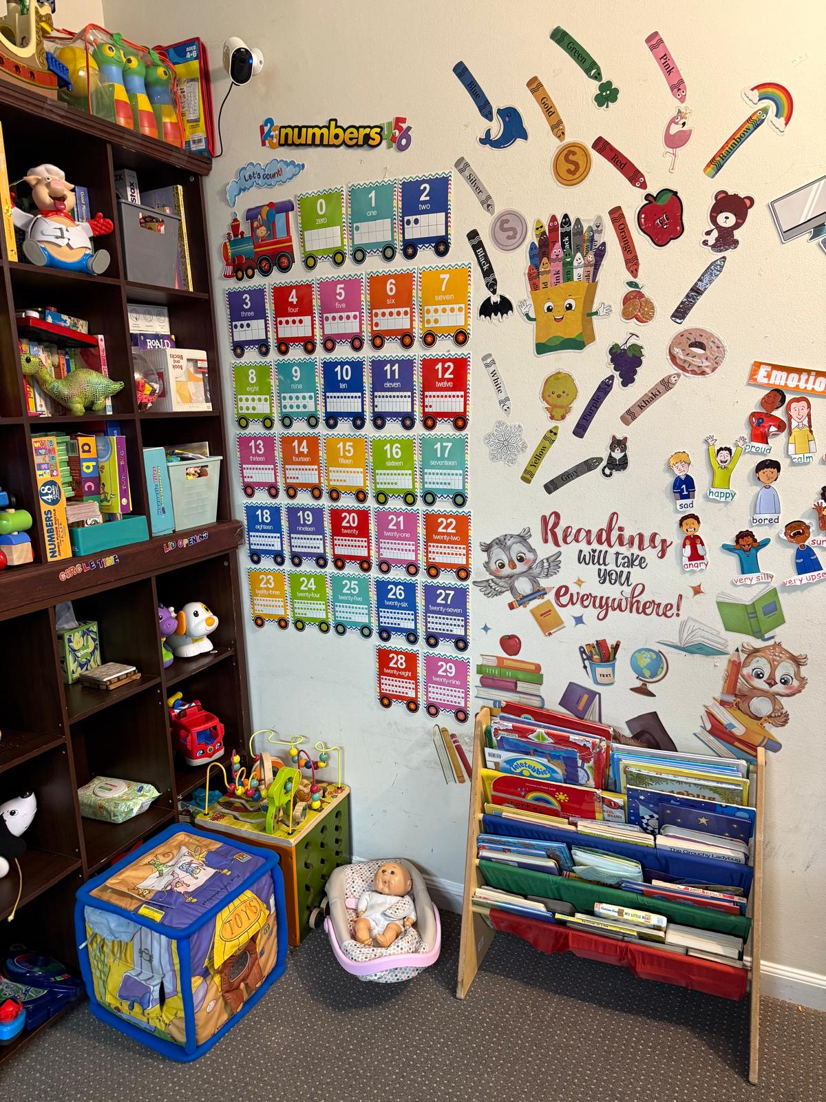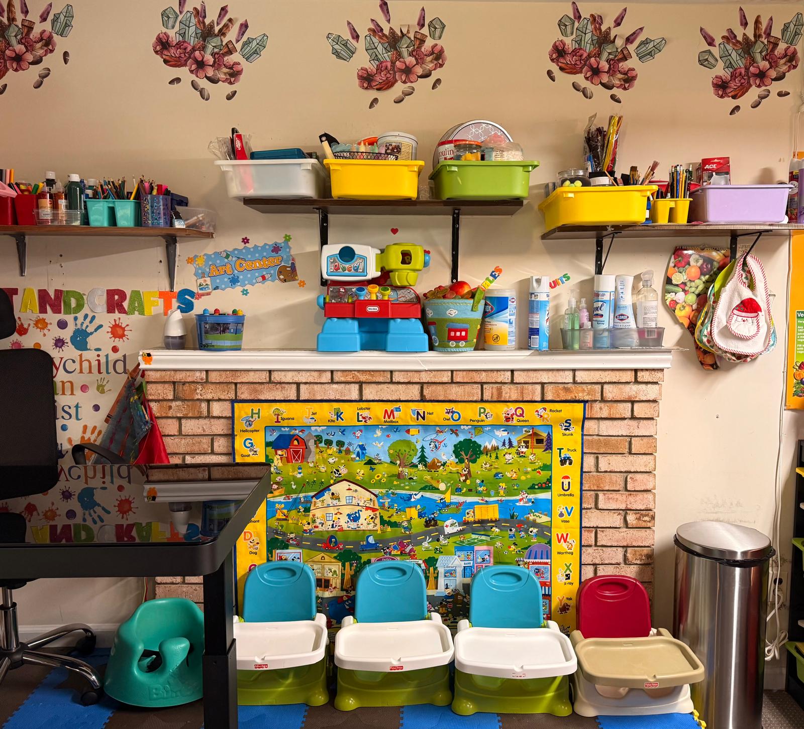 Every corner of our daycare is thoughtfully designed to inspire curiosity and joyful learning. Our space is meticulously organized with labeled areas and diverse activity stations, encouraging independence and exploration. We actively incorporate rich sensory experiences using a variety of materials – from soft textures to sturdy blocks and engaging water play – all crafted to enhance fine and gross motor skills. Vibrant wall decor and educational posters transform our rooms into an immersive learning landscape, sparking imagination and discovery. And for boundless outdoor adventures, our expansive and interactive backyard awaits, offering plenty of room for active play and exploration.